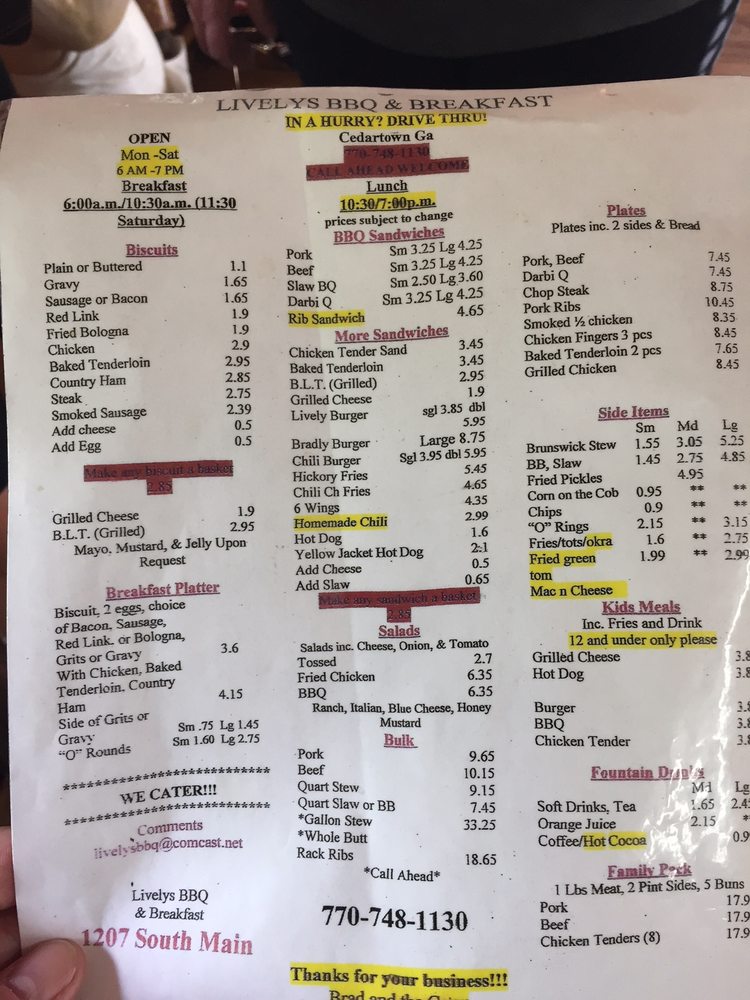 Welcome to Lively's BBQ, a gem located in Cedartown, GA, where every dish embodies the spirit of perfectly smoked meats and southern hospitality. This barbecue haven specializes in breakfast and brunch, with a menu that tantalizes taste buds at every turn.